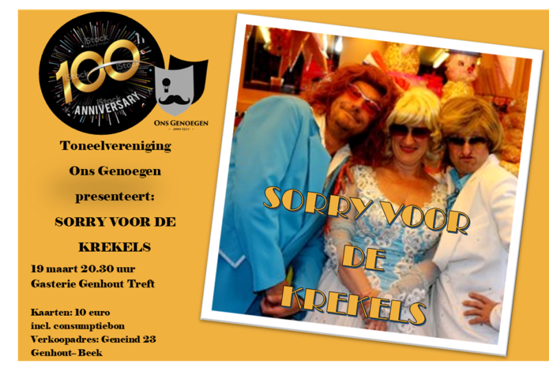 Nu alle coronalichten weer op groen staan kunnen we eindelijk in de herkansing! De champagnekurken mogen knallen want ons jubileumjaar gaat dan officieel van start. Onder het genot van een drankje zal Sorry voor de Krekels de sterren van de hemel spelen en kunnen de voetjes van de vloer. Voor degenen die al kaartjes hadden blijven deze uiteraard geldig. Voor iedereen die de boot bijna had gemist zijn er nog kaartjes beschikbaar. Deze kosten 10 euro inclusief een consumptiebon en zijn vanaf nu te koop bij Jo Neutelings, Geneind 23, Genhout-Beek. Laten we er samen een onvergetelijke avond van maken. Wij verheugen ons erop om jullie op 19 maart om 20.30 uur in Gasterie Genhout Treft in Genhout te mogen verwelkomen!